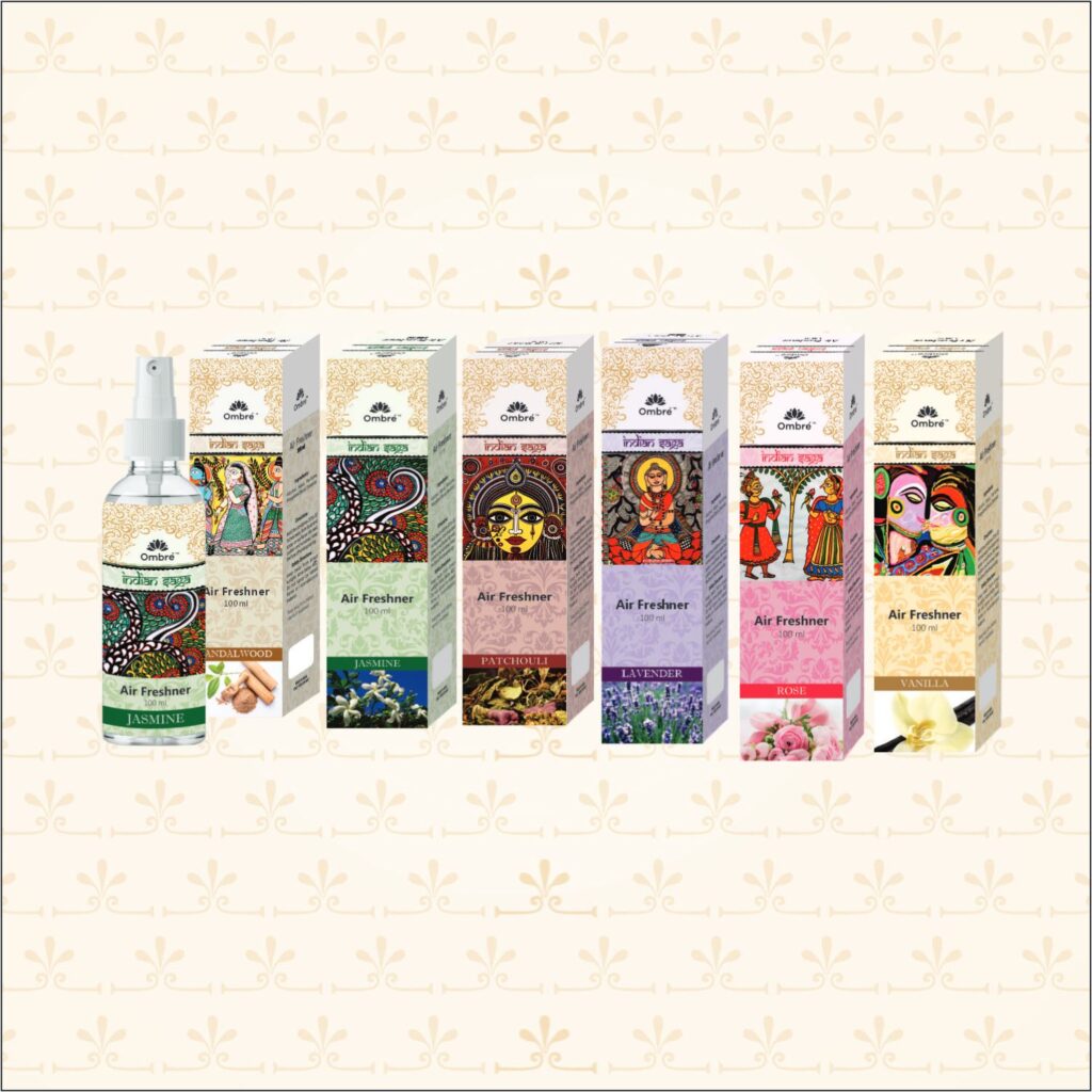 Ombre™ Indian Saga Air Freshener Spray (100 ml) | Premium Aromatic Scents for Home, Office, and Car – Patchouli, Vanilla, Jasmine, Lavender, Rose, and Sandalwood